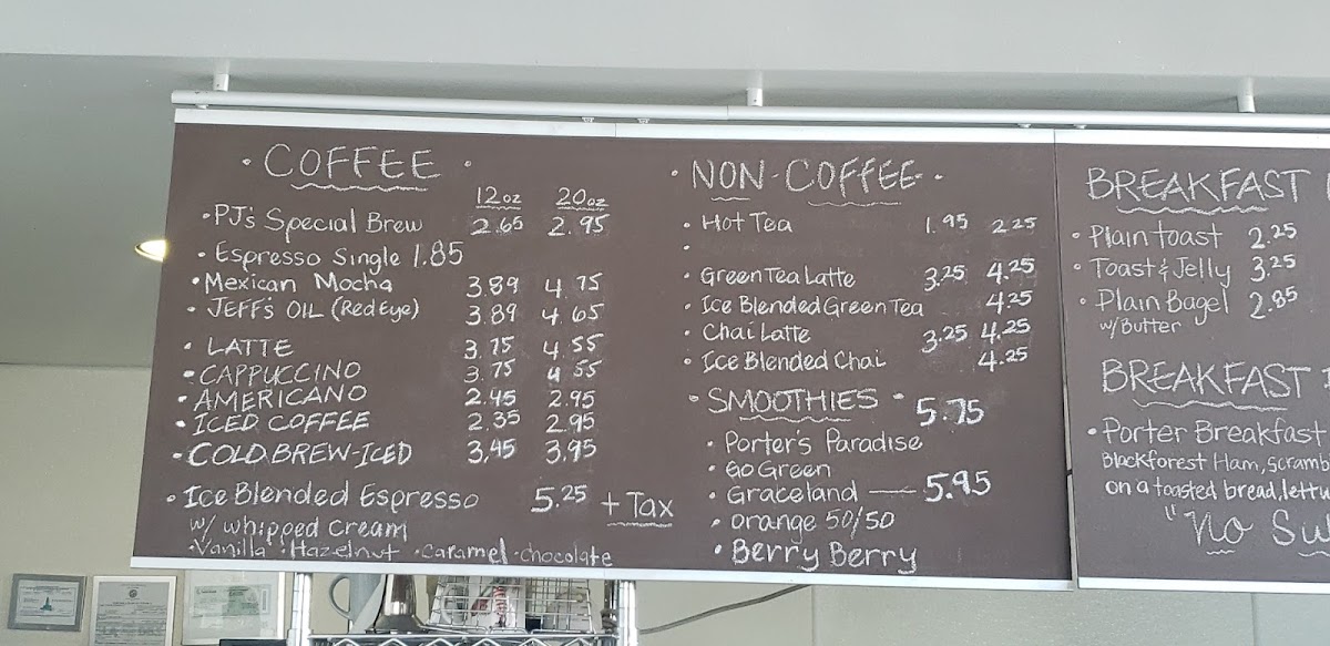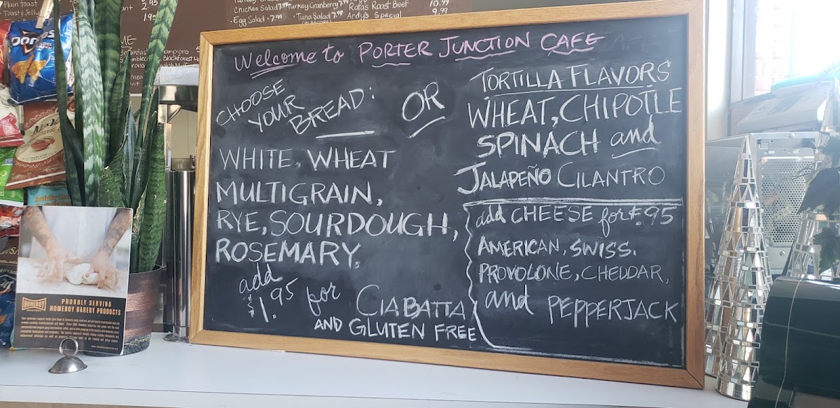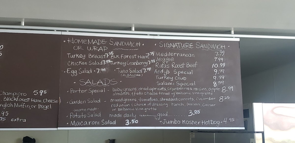 From a reviewer’s perspective, the menu at The Porter Junction Cafe offers a satisfying mix of quick bites and hearty classics that cater well to a busy crowd without sacrificing variety. The “Breakfast in A Rush” section keeps things simple with staples like Bagel, Butter Croissant, Croissant Toast Bread, and Fresh Baked Cookie Made Daily, while “Breakfast Right on Time” steps it up with more filling options such as Oatmeal, Porter Breakfast Sandwich, and Breakfast of Champions. For lunch, the homemade sandwich lineup-including Smoked Turkey Breast, Black Forest Ham, Turkey Cranberry Chicken Salad, and Egg Salad-delivers familiar comfort, while the signature creations like Rafa's Roast Beef, Andy's Special, Turkey Club, Salami Special On Ciabatta, and Mediterranean Sandwich On Ciabatta add a more distinctive touch. The salad offerings, including Porter Special, Garden, Side of Homemade Potato Salad, and Side of Macaroni Salad, provide lighter yet still satisfying alternatives. Finally, the quick menu with items like Cheese Melt Sandwich, Jumbo Kosher Hot Dog, Peanut Butter and Jelly, Chile Cheese Dog, and Assorted Chips rounds things out with easy, grab-and-go options, making the overall menu feel approachable, well-balanced, and ideal for both a quick stop or a casual meal.